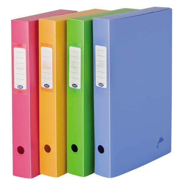 Scatola in polipropilene colorato, chiusura con bottone e pratico foro per l'estrazione.