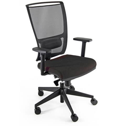 È dotata di supporto lombare regolabile, schienale in rete nera up-down, seduta Synchro con traslazione e antishock, braccioli inclusi e rivestimento ignifugo Classe No Flame.