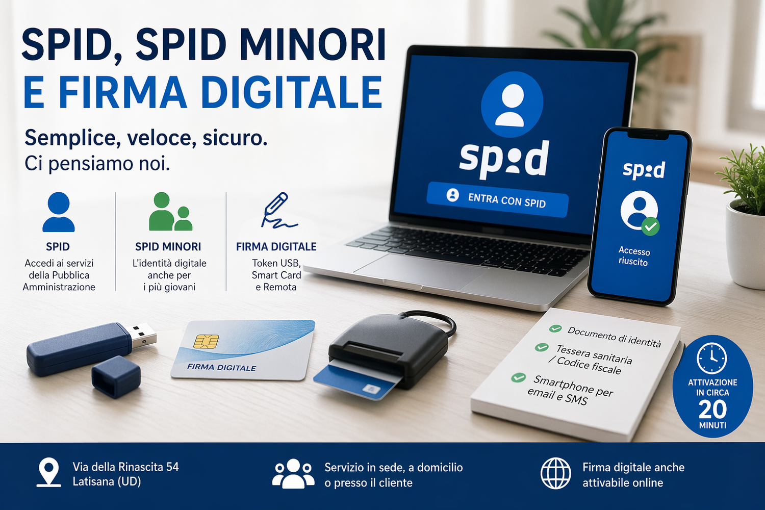Da BATTIVELLIWEB offriamo un servizio completo per il rilascio di SPID, SPID per minori e firme digitali (token USB, smart card e firma remota), pensato per semplificare al massimo ogni passaggio.