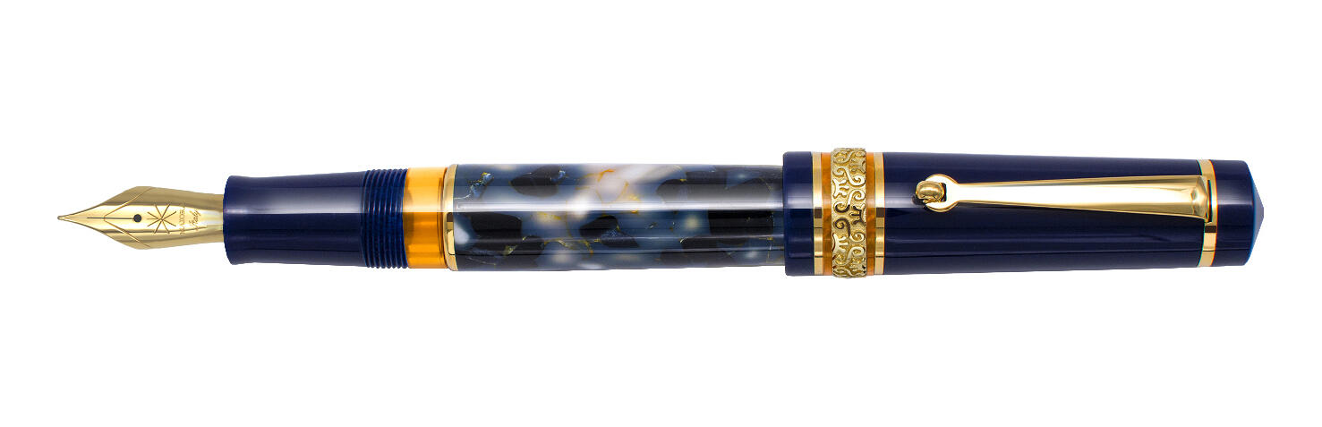Stilografica, Vera in argento massiccio 925 millesimi; caricamento a stantuffo, finestra trasparente per controllo livello d’inchiostro, pennino acciaio placcato in oro giallo 24 carati.