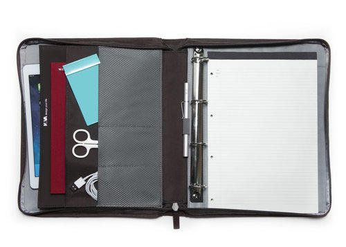 Portablocco formato A4 della linea “Easy +” realizzato in poliestere antigraffio e antipioggia con inserti in PU. Internamente organizzato con: blocco A4, porta penne, tasche porta iPad, porta documenti e porta biglietti da visita. Dotato di anelli rimovibili e chiusura con cerniera. La pratica maniglia facilita il trasporto del portablocco e ti permette di portarlo sempre con te.